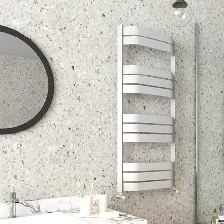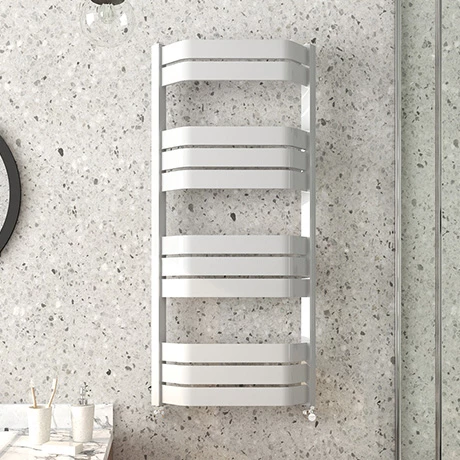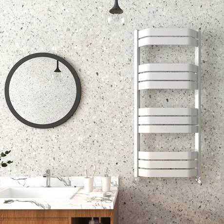 The Milan bow-fronted white designer vertical heated towel rail features an innovative modern design, manufactured from durable steel with a quality white finish, this stylish bow-fronted flat panel towel rail provides superb heat output which will gently warm towels and your bathroom or cloakroom.